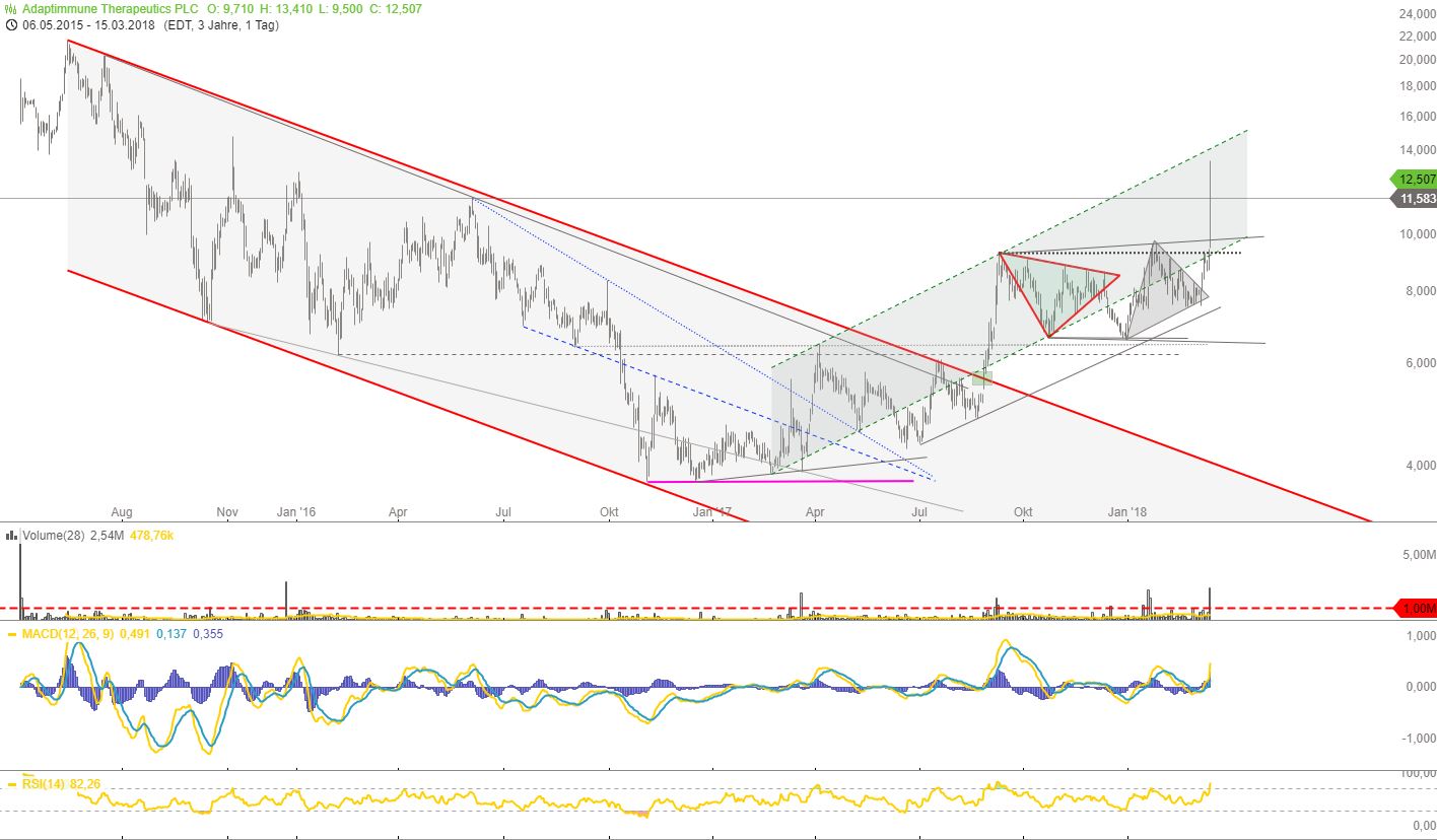 ist ein wieder erwachtes Thema in der US T-Zellindustrie, nachdem CAR-T bislang kaum Fortschritte zeigen, genausowenig wie die beiden grossen TCR Mitbewerber von Adaptimmune Kite Pharma und Juno. Letztere sind - wohl vorallem wegen ihrer CAR-T Bereiche - inzwischen komplett von grösseren Fischen geschluckt worden (Kite -> Gilead für rund 12 Milliarden und Juno -> Celgene für rund 9 Milliarden US-Dollar).