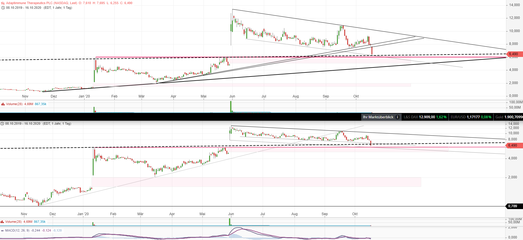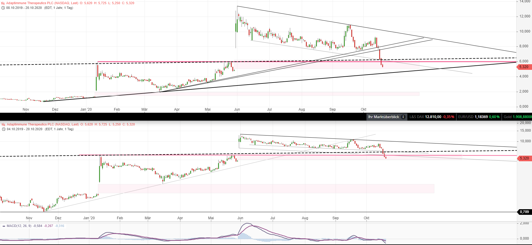 Dann mag das Geschehen vom US-Wahlergebnis abhängen und spätestens Mitte November (12-ter ist die eigentliche Datenpräsentation) auf der SITC2020, bei der ausführlichere Daten in der bekannt gewordenen Studie und drei weitere eigene sowie drei GSK-Präsentation unter Umständen die Sache wieder auf den Kopf stellen, zumal wenn sie besser als jetzt vom Markt erwartet ausfallen sollten. Hilfreich könnten auch besser als erwartete Quartalszahlen von Adaptimmune sowie damit verbundene Meldungen / Erläuterungen / Analysten auf der Pressekonferenz sein.