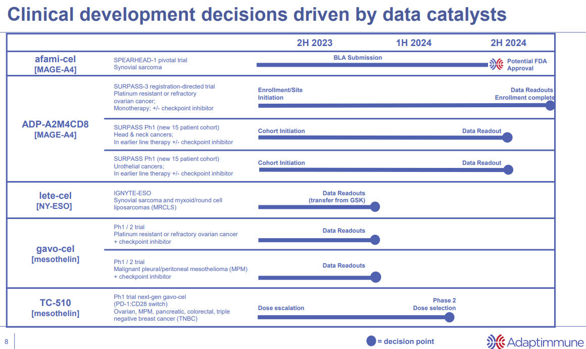 Mögliche Umsätze durch Afami-Cel abzuschätzen ist noch etwas früh, da weder die Kosten noch die tatsächlich erreichbaren Patienten feststehen. Man kann aber die Einmalkosten für die am Markt befindlichen CAR-T Therapien mit ca. $250-$500 tausend US-Dollar oder die ähnlich hohen Jahreskosten der TCR BiSpezifics der Schwesterfirma Immunocore heranziehen. Wenn Adaptimmune es schafft 50 Patienten im ersten Zulassungsjahr zu rekrutieren, wären es für Synovial Sarkoma ca. 15-25 Millionen US-Dollar. Mit einer Ausweitung auf MRCLS via NY-ESO-1 (Lete-cel) käme dann vielleicht der gleiche Betrag hinzu. Von der Umsatz-Milliarde ist man aber bei den aktuellen Indikationen erstmal weit entfernt und müsste dafür Zulassungen in weiter verbreiteten Indikation wie dem Eierstock- oder Blasenkrebs erhalten.