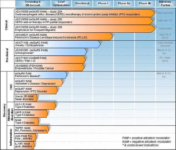 Neben der laufenden Zusammenarbeit mit Janssen Pharmaceuticals zur Suche nach möglichen Anwendungsgebieten für ADX71149 sind laut Mitteilung derzeit fünf weitere Produktkandidaten meist in vorklinischer Entwicklung. So wird für Dipraglurant (mGluR5NAM) der Beginn einer Phase-I-Studie zur Rezeptor-Anbindung sowie bei Dystonie in Aussicht gestellt. Weiter soll die vorklinische Forschung mit dem Wirkstoff in Teilbereichen der Dystonie sowie im Hinblick auf dessen Eignung als Antidepressivum untersucht werden.