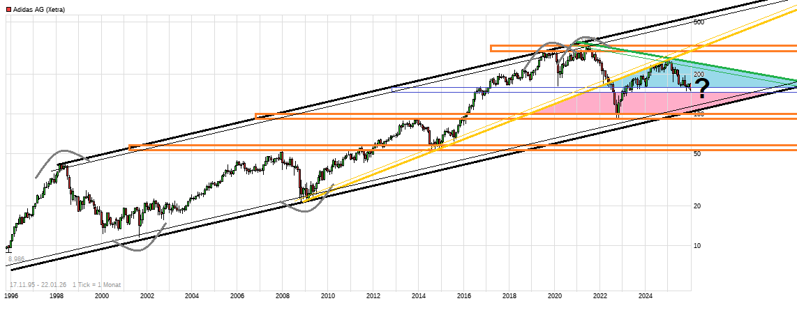 adidas Aktie: Gefährliche Lage! Droht erneuter Kurssturz? - 20.01.2026 - www.4investors.de/nachrichten/...?sektion=stock&ID=187790 ".... Bei der adidas Aktie spitzt sich die Lage nach dem gestrigen deutlichen Kursverlust zu: Mit aktuell 150,95 Euro in der XETRA-Vorbörse liegt der Aktienkurs des Sportartikel-Konzerns aus Herzogenaurach unmittelbar an wichtigen charttechnischen Unterstützungen. Diese haben sich im Bereich 150,40/151,05 Euro im November des vergangenen Jahres gebildet und sind aktuell das bisherige Tief einer Baisse, die seit Februar des vergangenen Jahres das charttechnische Bild der adidas Aktie prägt und bei 263,80 Euro ihren Ausgangspunkt hat. Ein Rutsch unter diese Zone könnte dem Aktienkurs von adidas massives Abwärtspotenzial eröffnen. Charttechnisch wären dann sogar Kurse unter 100 Euro möglich, mit einer sehr starken Unterstützung am Mehrjahrestief aus 2022 bei 93,40 Euro. Erste charttechnische Unterstützungen fände die adidas Aktie im Breakfall aber zunächst in der Zone zwischen 135 Euro und 140 Euro. Noch aber hält der wichtige Supportbereich bei 150,40/151,05 Euro dem Druck stand. Wie lange, bleibt abzuwarten. ... Ein Abprall der adidas Aktie nach oben bringt das gestern aufgerissene Abwärtsgap bei 156,65/159,50 Euro ins Blickfeld. Kann der DAX-Titel den Bereich überwinden, wäre spätestens 169,60/171,30 Euro eine hohe Hürde. Ein Ausbruch hierüber würde ein bullishes Trendwendeszenario abschließen und zumindest kurzfristig Aufwärtspotenzial schaffen. Weitere Hürden wären dann neben 17,530 Euro unter anderem an der 200-Tage-Linie und oberhalb von 189,40 Euro zu finden...