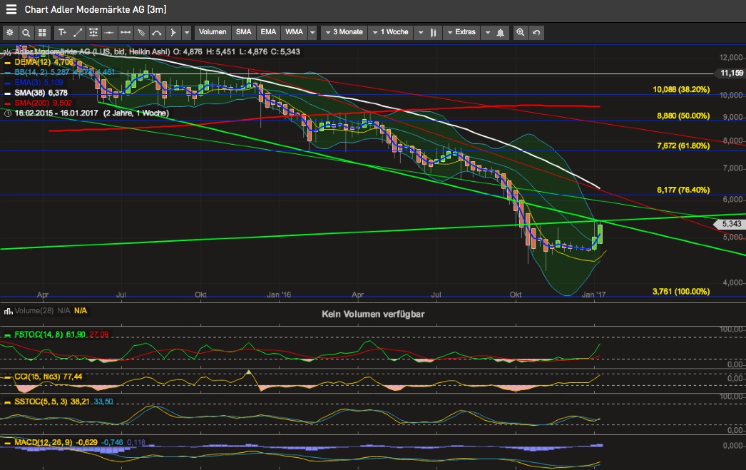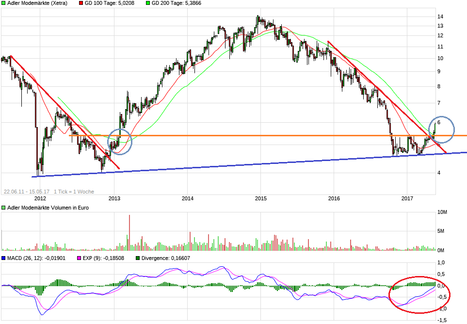 Wie gesagt, kein Highflyer, aber fairen Wert würd ich bei 7 € taxieren. Wenn sich die verbesserte Entwicklung dann auch 2018 fortsetzt, sind auch deutlich höhere Kurse möglich, aber das wird der Markt wohl erstmal abwarten wollen. Dafür ist das Geschäft in der Branche dann doch zu unsicher, um in diesem Jahr schon wieder Kurse von 8-9 € zu sehen, wobei die Charttechnik durchaus dafür spricht, und selbst Tom Tailor hat ja ne starke Rallye hingelegt, obwohl weit unsicherer. Ich geh aber erstmal nur von 7 € aus.
