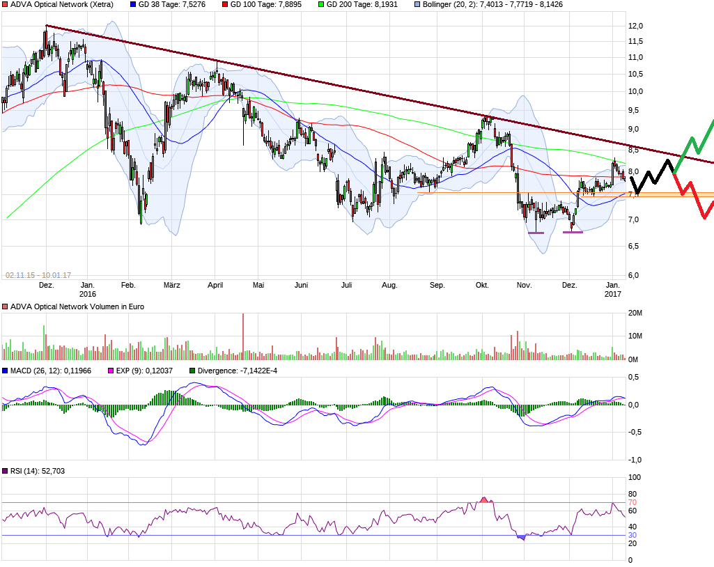 Letztlich muss Adva mit einem vernünftigen Ausblick im Farbruar/März aufs Jahr 2017 überzeugen. Wenn dann auch Q1 gut anläuft, könnte man im 2.Quartal den Abwärtstrend durchbrechen und hätte dann wohl wieder gutes Potenzial bis 11-12 €. Bis dahin muss man sich halt dieses Gedümepl anschauen und hoffen, dass Adva beim Ausblick nicht enttäuscht. Bißchen Bedenken hab ich ja nach wie vor hinsichtlich der Margen bzw. Gewinne. Mich haben die letzten Quartalsdaten nicht überzeugt. Andererseits ist Adva vom EV/Ebitda her abgesehen vielleicht von 1-2 Langweilern (wie Freenet) die günstige TecDax-Aktie und hat somit wohl schon schlechte News eingepreist.