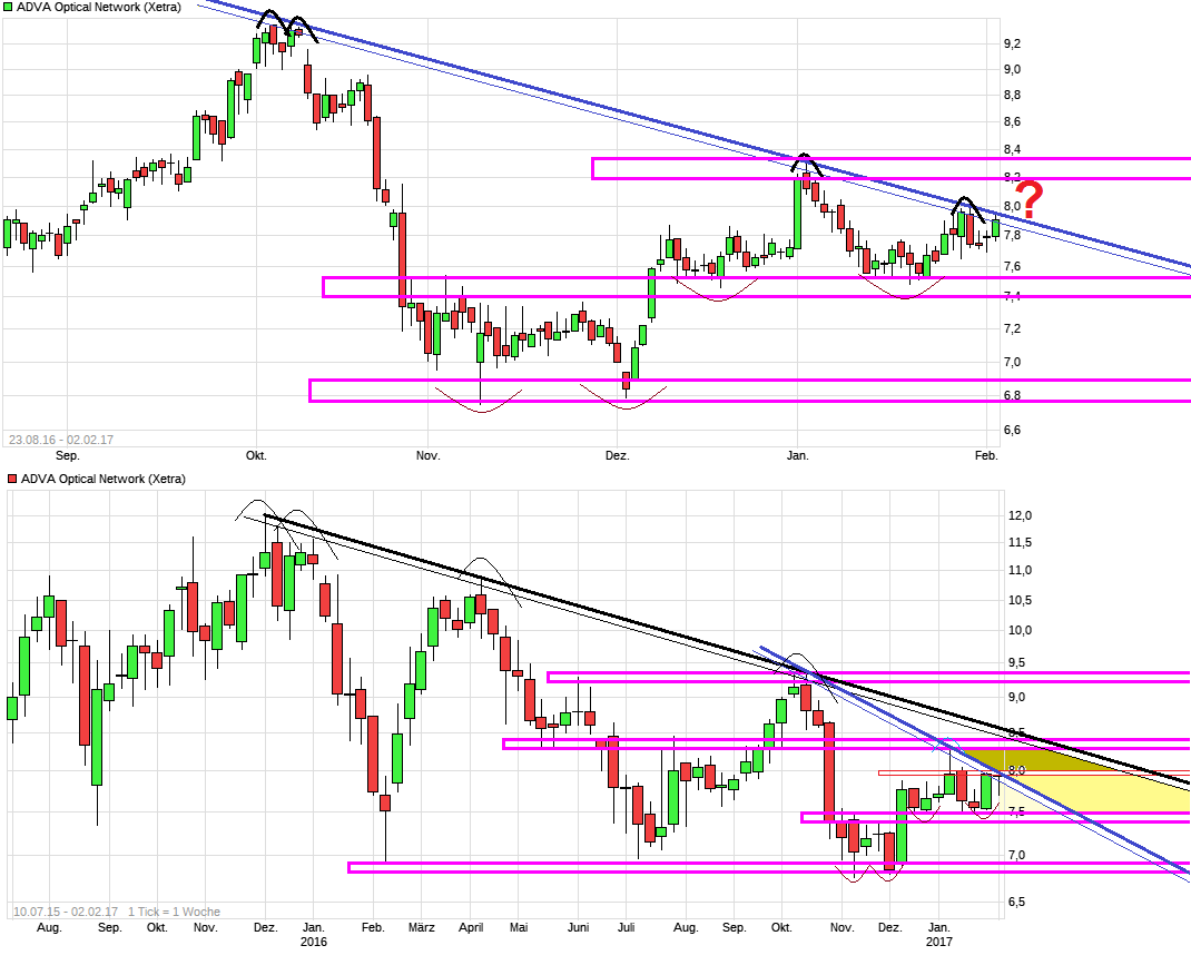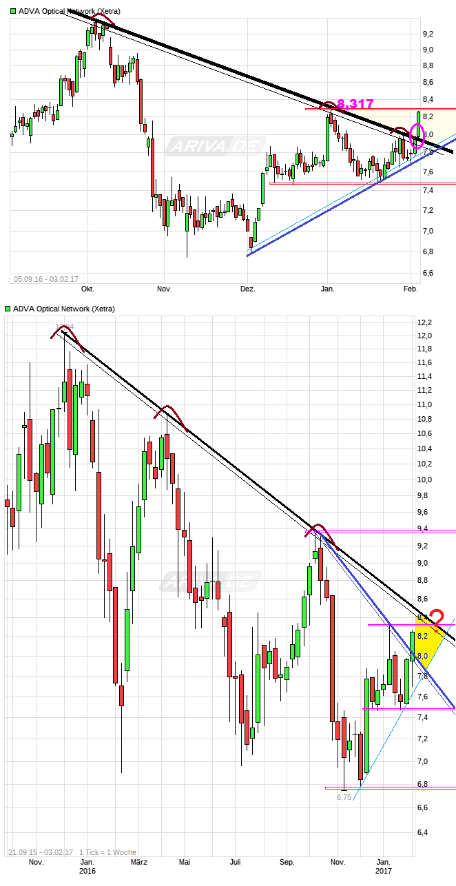 Zweite Antwort: auf kurzfristige Sicht habe ich – neben den allgemein sehr luftigen Höhen im Gesamtmarkt – Sorgen, was das nächste Zahlenwerk von ADVA betrifft. Historisch gesehen, hat das 1Q im Schnitt einen Margenrückgang von 300-400bps ggü. dem Vorquartal gesehen. Wie käme eine evtl. Guidance für 1Q17 von 1-3% im Markt an? Den Einfluss des jüngsten Dollar Anstiegs und das EUR/GBP Verhältnis (in 1Q16 noch bei ganz anderen Leveln) kann ich einfach nicht einschätzen. Und bei Unsicherheit lass ich lieber erst mal die Finger weg, vllt sehen das andere auch so. Beim Umsatz das gleiche, aus der 2016er Quartals-Entwicklung von 122/157/159/133e Mio kann ich nix herauslesen, was ich für das erste Quartal erwarten sollte. Und bei Unsicherheit lass…na ja, wie bereits geschrieben. Dass es danach zu Anpassungen der Analystenschätzungen kommen kann, zählt für mich auch bei den Unsicherheitsfaktoren dazu.