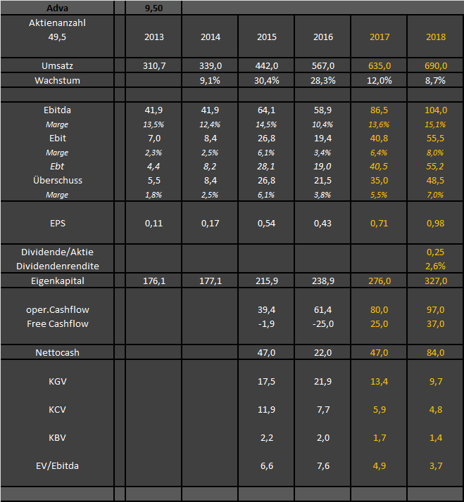 Das Problem bei ADVA ist jüngst doch in erster Linie gewesen, daß die Erwartungen der gierigen und aufgehetzten "Meute" viel zu schnell gestiegen waren als es die Zahlen und Prognosen jüngst noch hergeben konnten, die sich eben nur "normal" entwickelten". Für Kurzfristzocker die auf positive Überraschungen noch zusätzlich gewettet hatten war das am Ende zu wenig. Wer kein in kurzen Perioden denkender Trader ist, der muß an der Börse auch mal Zeit mitbringen und Dinge sich etwas langsamer entwickeln lassen. Letztes Jahr war das Umsatzwachstum stark und die Marge nicht so toll. Dieses Jahr ist das Wachstum des Umsatzes nicht so stark, aber dafür wird sich die Marge von Quartal zu Quartal weiter erhöhen. Ideal wäre man sieht 2018 eine gute Marge mit einem dann hoffentlich wieder stärkerem Umsatzwachstum. Kommt auch immer auf das Investitionsklima bei der Kundschaft an. Wer auf so ein Szenario setzt, der sollte einen Zeithorizont haben der über Tage und Wochen hinausgeht und eher über mehrere Quartale angelegt ist. Wer irrsinnige Erwartung an die Performance hat, der soll sich eben eine Zeitmaschinie kaufen und in die Spätphase der Nemax-Bubble zurückreisen. Oder direkt mit hochgebelte Derivate (mit höherm Risiko) long oder short zocken. Frag man deine Bank wieviel Zinsen sie dir in der letzten 5 Monaten für dein Geld gegeben hätte. Dieses lamentieren und jammern bringt nichts. Konso ist Teil des Spiels, was man eben akzeptieren muß. Hat man ein breites Portfolio ohne Klumpenrisiko und betreibt systematisches Money&Risk Management, dann macht es einem die Sache leichter.