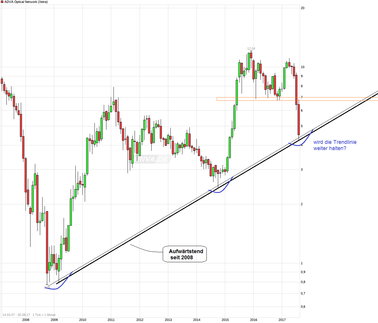 ( und vielleicht auch erste Leerverkäufer?) wollen den SellOff nutzen, um sich wieder neue zu positionieren nach erfolgreichem antesten der langjährigen Aufw.trendlinie. Wäre auch recht verwunderlich, wenn diese Linie ohne technische Gegenreaktion mitgefallen wäre. Die News von ADVA sind sicherlich unerfreulich, die Restrukturierung in Q.3 belastet jetzt noch zusätzlich, aber noch ist nicht absehbar wieweit sich die Lage in 2018 vielleicht wieder leicht bessern kann. So wie man Kunden verlieren kann an Konkurrenten, kann man auch selber mal zum Zuge kommen bei deren Kundschaft. Ist halt eine sehr kompetitives Umfeld. Wer in solche Aktien investiert, der muß sich auch bewußt sein, daß es keine "Schlaf-Gut-Aktie" ist, sondern ein Wert der sich durch große Volatilität in den letzten 10 Jahren ausgezeichnet hat. Entsprechend gab es ja genug größere "Vorwarnungen" im Chat die letzten Monate, wo man zu klar besseren Kursen als gegenwärtig noch an die Seitenlinie wieder gehen konnte, wenn man die Signale beachtet hat. Viel negatives Sentiment dürfte gegenwärtig auch schon wieder eingepreist und es muß sich von Quartal zu Quartal jetzt zeigen, ob man da überreagiert hat. Wer also spekulativ veranlagt ist, der könnte diese Situation jetzt so nutzen, daß man nahe über der langjährigen Aufw.trendlinie eine Position eingeht und diese relativ knapp unter dieser Linie absichert und dynamsich nach oben stets weiter anpasst. Dann könnte man für den Fall diese wichtige Linie würde doch nicht mehr verteidigt (aus welchem Grund auch immer), noch relativ unbeschadet wieder raus. Denn noch ist das Eis eher dünn auf dem man steht. Ist also etwas eine Frage, ob man kaufen soll, wenn die Kanonen donnern oder ob man nicht in das fallende Messer greifen sollte. Was richtig ist, wird man - wie immer - erst rückblickend besser beantworten können. Ist etwas eine Typsache wie man hier vorgeht. So oder so, es ist ratsam relevante Marken im Auge zu behalten, vielleicht nicht zu große Positionen hier schon zu kaufen und sich absichern, um zu versuchen Verlustrisiken kleinzuhalten.