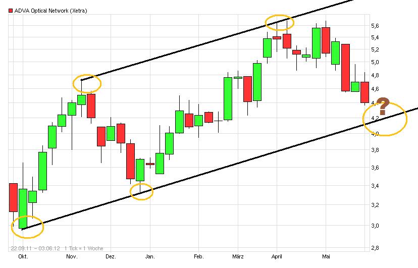 Trendlinienbruch und Doppelhoch sind derzeit die kräftigsten Argumente der Bären, mit denen nun auch die Adva Aktie nach einer langen Zeit relativer Stärke mit entsprechenden Verkaufssignalen daherkommt. Bestätigt wurden diese zuletzt durch den klassischen Pullback an das Ausbruchsniveau bei 4,87 – 4,74 Euro. In diesem nun zum Widerstand gewordenen Bereich prallten die Kurse letzte Woche nach unten hin ab und sollten nun ihre Abwärtsbewegung in Richtung 4,23 Euro oder gar 3,65 Euro weiter fortsetzen. Erst ein schneller Kursanstieg über 5,05 Euro könnte dies verhindern.