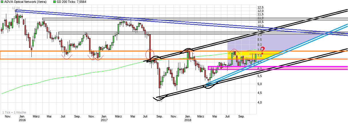Sehe ich auch so. Besonders die Unsicherheit über eine mögliche kostspielige größere Übernahme ist erstmal raus. Das ECI Telecom Gerücht war ja vor einige Wochen mit ein Auslöser für einen heftigen Absacker. Ich hatte mich damals auch erstmal hier deswegen verabschiedet solange das Thema so ungeklärt im Raum stand. Bin nach der Richtigstellung im Vorstandswoche-Interview Mitte Oktober dann aber wieder in den Wert gegangegen, da ich doch weiterhin der Meinung bin, daß hier einige Dinge inzwischen auf den richtigen Weg gebracht wurden und 2019 nochmal ein deutlicher Schritt nach oben möglich ist, wenn man die Marge möglichst weit in die Nähe der 7% bringen könnte. Das mit Kuzniar ein aktivistischer Investor hier stetig seine Position ausbaut und über 20% inzwischen ist, läßt auch die Vermutung zu, daß hier noch ungehobene Kurspotenziale möglich sind bzw. von dessen Seite der Druck auf das Management erhöht wird ( eventuell um ADVA selber als Übernahmeobjekt ins Schaufenster zu stellen?). Teleios wird stetig höheren Einfluß im AR und der HV gewinnen und damit auch auf den Vorstand. Wäre auch nicht erstaunt wenn Teleios noch auf 25+x% geht, um eine sichere Sperrminorität zu bekommen. Euro/Dollar entwickelt sich wieder vorteilhafter für ADVA und es könnte ein verlorener Großkunde wieder zurückgewonnen werden, was natürlich deutlichen Einfluß auf Umsatz&Marge hätte. Genau der Verlust von Großkunden hatte ja ADVA damals so in den Keller getrieben. Entsprechend wäre jeder Großkunde der wieder kommt ein deutlicher Treiber nach oben. Wichtig wäre den harten horizontalen Widerstandsbereich um die 7,48/50 mal rauszunehmen und sich dann gerne weiter zur Oberseite des schwarzen Aufw.trendkanals zu bewegen. Klar, ist erstmal Wunschdenken und ADVA muß erstmal weiter liefern, d.h. Prognosen Quartal für Quartal möglichst im höheren Bereich der Korridore erfüllen, besonders bei der Marge. Zudem sollte der Gesamtmarkt und das Sentiment für Techwerte möglichst keine weitere klare Fallsucht bekommen, da dann für gewöhnlich weniger auf individuelle Dinge noch geschaut wird und eher mit der Rasenmähermethode quer durch das Portfolio in etwas Panik gefegt wird.