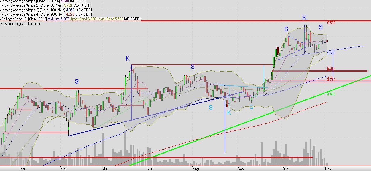 Was erscheint dir wahrscheinlicher? Dass der Kurs von 5,60 zunächst auf 5,90 hochläuft und dann ausbricht? Das wäre wahrlich bedeutend. Oder dass er bei 5,60 nach unten dreht und die 5,52 durchbricht? Auch dann wäre der Ausbruch deutlich - nur in die andere Richtung...