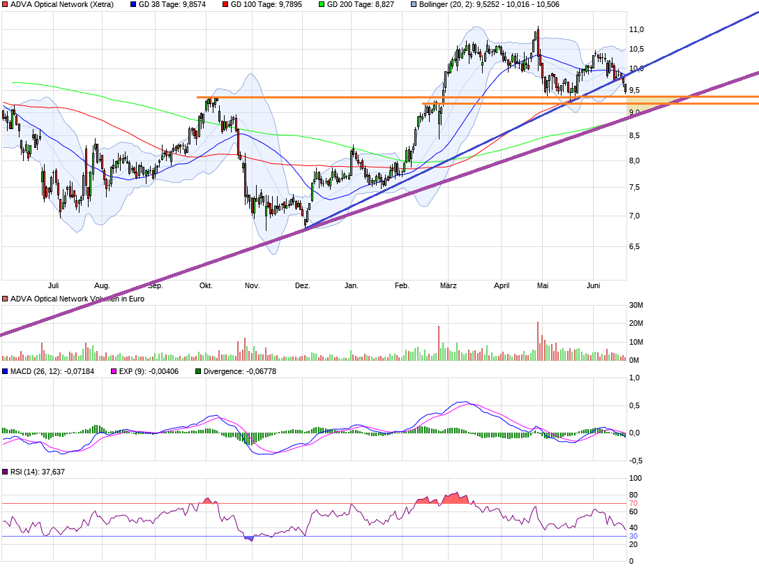 Zusammenhang mit dem Quartals- / Halbjahresende stehen? Bei derartigem Window Dressing versuchen ja Vermögensverwalter zum Stichtag hin die Underperformer der jüngeren Zeit in ihrem Portfolio noch etwas abzubauen und ihre "Lieblinge" zu hätscheln. Seit der Bekanntgabe der Q.1 Zahlen und des Ausblicks auf 2017 ist ja bei ADVA defacto die Luft raus gegenüber dem Gesamtmarkt/TecDax. Von daher wäre ADVA also eher ein Kanditat der auf der Abbauliste stehen könnte zum Stichtag hin. Zudem ist man ja jetzt auch schon soweit zurückgekommen, daß es eigentlich nicht verwundern würde, wenn es dann auch zu einem "harten" Test des seit 2014 steigenden Aufw.trend noch käme und z.B. die Hj.1 Zahlen/Prognosen in wenigen Wochen dann den Ausschlag geben, ob man den Trend weiter verteidigen kann oder ob auch diese Linie gebrochen wird. Könnte also ein interessanter Juli anstehen, der hoffentlich den Bullen am Ende das bessere Ende beschert. Noch gibt es jedenfalls kein klares Zeichen, daß die laufende Konso schon final den Boden gefunden hat. Wäre natürlich schön, wenn daß Low von Mai nicht nochmal unterschritten wird, da man dann auf einen Doppelboden hoffen könnte, wenn es später wieder über die Region 10,40 gehen würde. Aber ich denken das wichtigere Zeichen wäre, wenn der seit 2014 steigende Aufw.trend nun weiter hält. Und der liegt aktuell noch ein kleines Stück unter dem Low von Mai. Entsprechend wäre es auch noch kein Beinbruch, wenn also das Mai-Low doch nochmal unterschritten würde und z.B. dann eine SL-Welle/Anschlußverkäufe bis zu dieser Aufw.trendlinie dann die Kurse treiben würde. Letztendlich braucht man einen guten Ausblick bei den anstehenden Hj.1 Zahlen und einen Gesamtmarkt, der in der Sommerpause jetzt nicht zu sehr "durchatmet", wenn die saisonal typische Marktflaute in der Ferienzeit wieder kommt. Na, schaun wir mal....