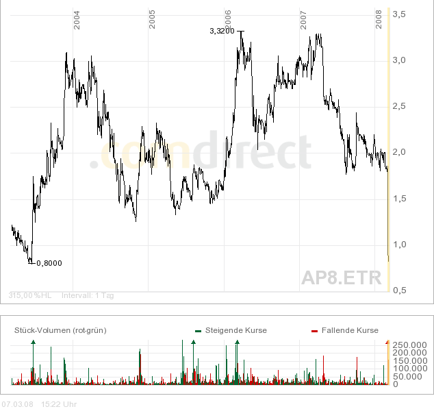 Rückblick: Die ADVANCED PHOTONICS Aktie markierte im Juni 2003 das Allzeittief bei 0,78 Euro und startete eine steile Kursrallye bis auf 3,43 Euro im Dezember 2003. Seit dem tendiert die Aktie seitwärts, wobei kontinuierlich höhere Tiefs ausgebildet wurden und die Handelsspanne sich verengte. Seit September 2006 tendiert die Aktie nun auf hohem Niveau knapp unterhalb der zentralen Widerstandszone bei 3,30 - 3,43 Euro seitwärts und drängt aktuell wieder nach oben. Das kurzfristige Chartbild ist bullisch zu werten, das mittelfristige ist neutral.