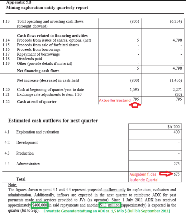 Aus dem cash flow report von Xstate werde ich nicht ganz schlau. Xsatate rechnet für Q3 2011 mit Explorationsausgaben von 0,605 Mio $. Wenn Sidi gebohrt wird, müßten die Kosten für Xstate jedoch bei ca. 1,1 Mio $ liegen (20% bis 5 Mio $ und 10% für alles darüber). Das ist merkwürdig. Andererseits weist Xstate für Q2 2011 Explorationsausgaben von 0,551 Mio $ aus. In der Summe würde das hinkommen. Vielleicht mußte da zuvor schon was gezahlt werden. Aber dazu paßt dann wieder nicht, daß ADX nur 0,102 Mio $ von den Bohrpartnern in Q2 bekommen hat. Oder zahlen die Bohrpartner direkt an die Bohrfirma, also nicht über ADX? Fragen über Fragen. Ich habs eher mit Steinen als mit Buchhaltung, vielleicht ist jemand unter uns, der uns da aufklären kann.