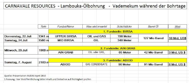 The change to a different mud system is undertaken in order to ensure that the primary Lambouka-1 reservoir target (the Abiod carbonate reservoir) is drilled most efficiently and with minimum drilling induced reservoir damage. This is expected to maximize the productivity of the Abiod in a success case. For a success case the Abiod formation is expected to contain condensate rich gas with the potential (for the P50 case) to contain 370 bcf of sales gas and approximately 80 mmbbls of liquids (based on the condensate gas ratio encountered at the Dougga gas discovery). The upside potential (the P10 case) is 244 mmboe (condensate + gas).
