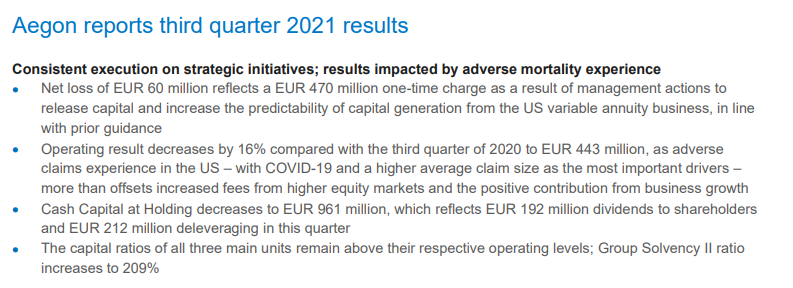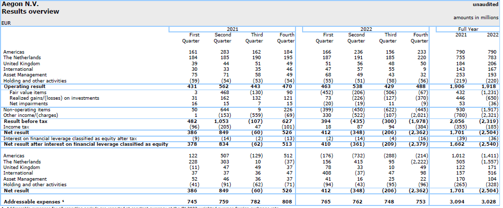 Am 27. Oktober 2022 gab Aegon bekannt, dass es eine Vereinbarung mit a.s.r. getroffen hat, um seine niederländischen Renten-, Lebens- und Nicht-Lebensversicherungs-, Bank- und Hypothekenaktivitäten mit a.s.r. zu kombinieren. Angesichts dieser Aktion wird Aegon die Niederlande nicht mehr als separates Segment gemeldet.