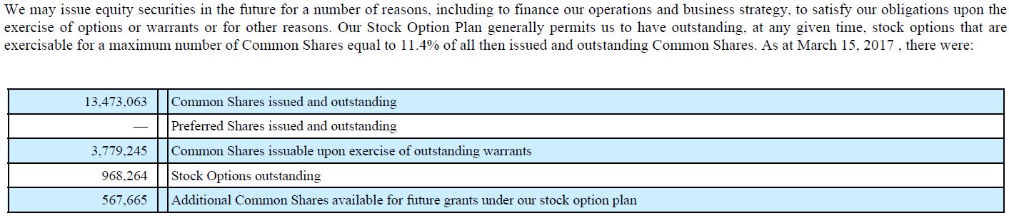 warrant to purchase one common share and 0.45 of a warrant to purchase one common share (the "November 2016 Offering"). Total gross cash proceeds