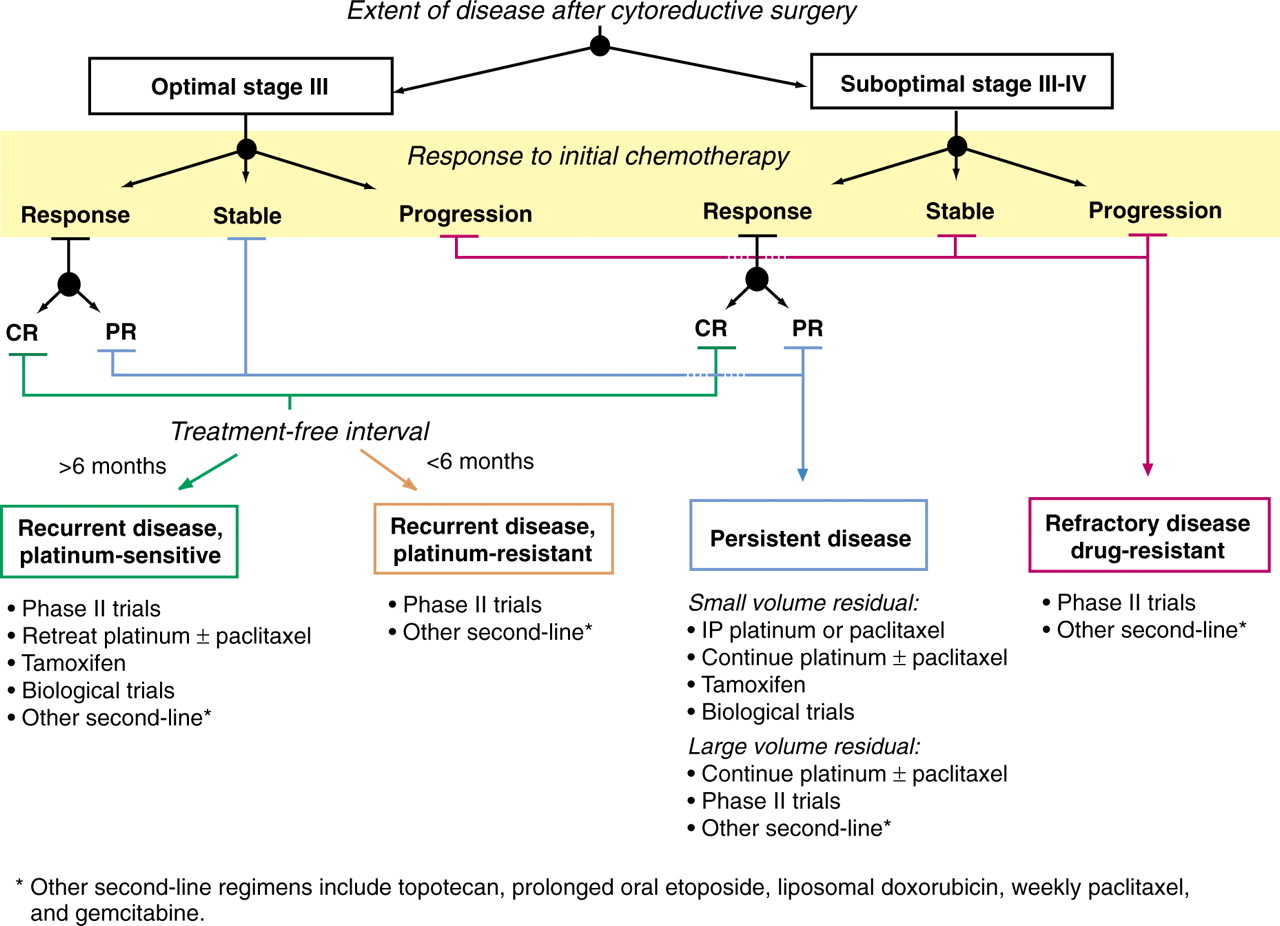 Carboplatin/paclitaxel is standard adjuvant therapy for stage III endometrial cancer and is also standard first-line therapy for metastatic or recurrent disease based on noninferiority and better tolerability compared with the three-drug regimen of paclitaxel/doxorubicin/cisplatin.9 Most of the landmark trials for metastatic disease were conducted before the widespread use of adjuvant chemotherapy, raising questions about the best treatment for women who have had prior adjuvant treatment. A recent publication suggests that the concept of “platinum sensitivity” be applied to endometrial cancer much as it is currently used for ovarian cancer. RRs to second-line platinum-based therapy for patients with platinum-free intervals of less than 6 months, 6 to 12 months, 12 to 23 months, and more than 24 months were 25%, 38%, 61%, and 65%, respectively. Median PFS for patients with platinum-free intervals of less than 12 months and ≥ 12 months was 4.4 months and 10.3 months, respectively.32 It seems likely that, as has been demonstrated with ovarian cancer, this paradigm of chemotherapy sensitivity applies to the use of most cytotoxic chemotherapy agents in general (ie, the longer the time since first-line chemotherapy, the better the RR and the longer the PFS). The second-line trials listed in Table 2 were performed in the setting of second-line chemotherapy for metastatic disease, and given that only approximately 20% to 25% of chemotherapy-naive patients have a complete response to first-line chemotherapy,7 the majority of patients in these studies would have had platinum-resistant or platinum-refractory tumors.