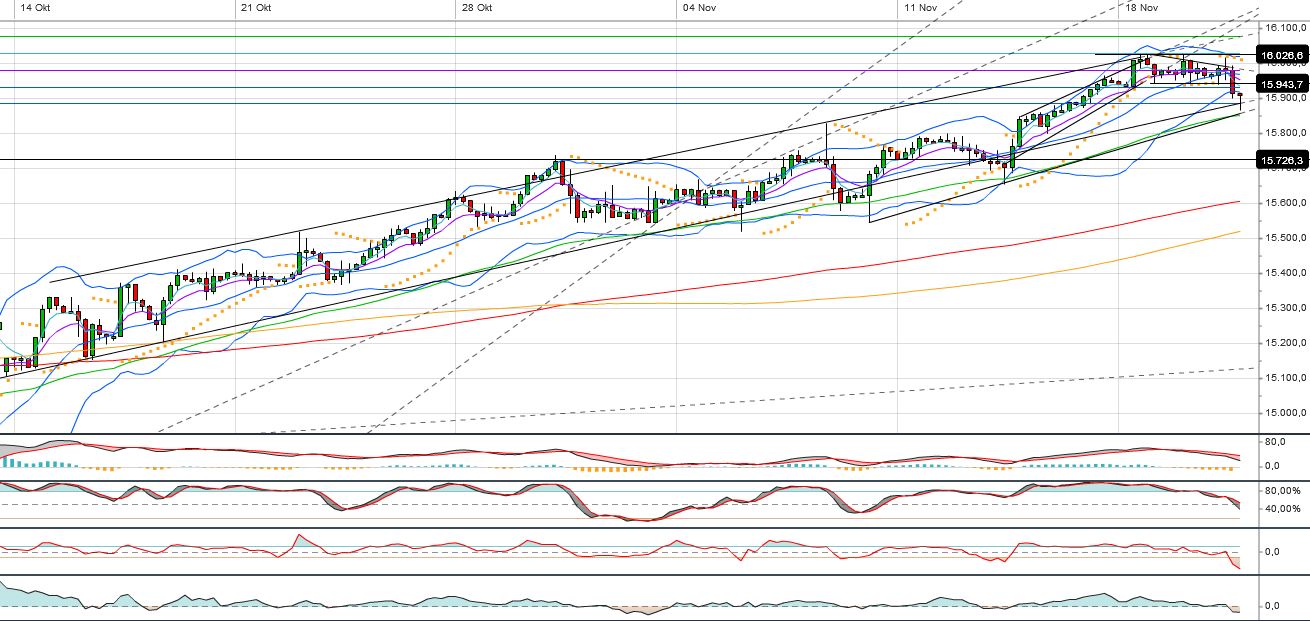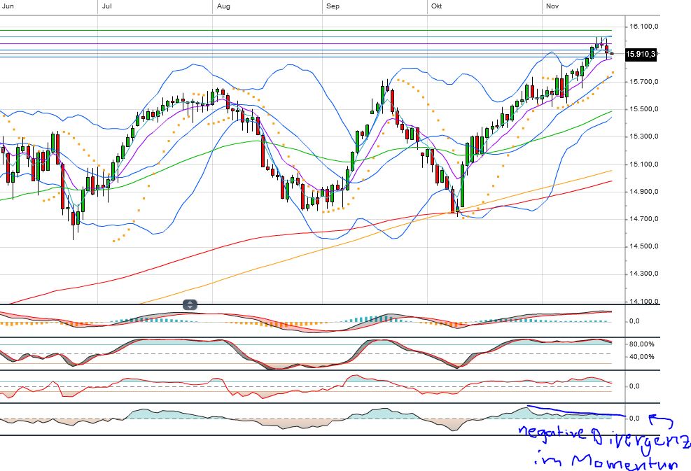 So wie's aussieht, fehlt dem Dow die Kraft, das erreichte Plateau doch noch euphorisch zu toppen. Was den Bullen nun offenbar abgeht ist die überzeugende Story. In der Pipeline sind Zinsanstieg, erodierende Earnings und Schrumpfung des Staatsanteils (am GDP) - alles andere als bullishe Fieberträume. Dabei spielt es keine Rolle, ob wir makro vorerst noch moderat expansiv oder schon moderat recessiv tendieren. Tapering bleibt dagegen ein nonevent, das QE-Moneyprinting Narrativ ist als Thema weitestgehend durch. Dem nicht zwingend legitimen CRV für short geschuldet bereite ich den entry nur in einer ersten Tranche vor (25%)