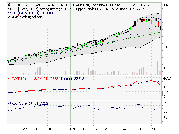 Die Aktie von Air France-KLM schloss gestern in Paris bei 31,92 Euro (+1,69 Prozent). (23.11.2006/ac/n/a)