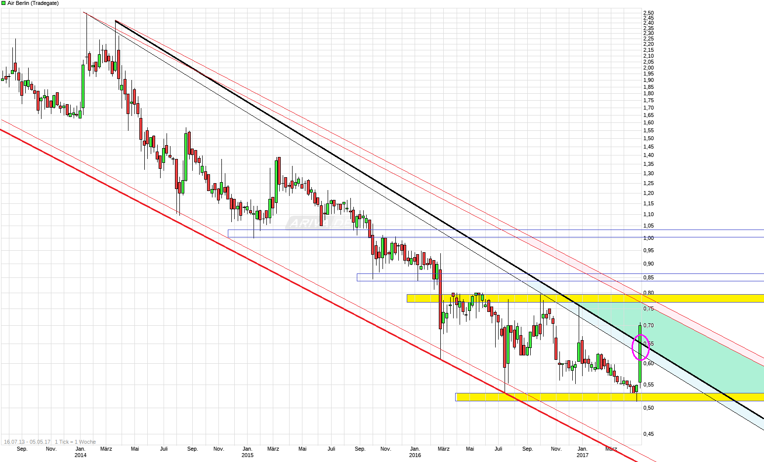 Und der damit einhergehende subjektive Glaube der Marktteilnehmer, daß spekulative Hoffnungen auch mal Wirklichkeit werden. Letztendlich ist alles weiter hochspekulativ. Ist ja nett, wenn die LH ihr Interesse jetzt laut anmeldet. Solange noch aber keine Lösung steht für die Lösung des Schuldenlastproblem, solange wird in erster Linie reines Wunschdenken den Kurs machen. Wenn man den Kursprung sieht, dann scheint momentan die Masse der Meinung zu sein, daß dieses Problem jetzt lösbarer erscheint als noch vor wenigen Wochen. Wie lange dieses kurzfristige Meinungsbild weiter bestehen bleibt und welche Widerstandsmarken noch fallen und damit technische Anschlußkäufe auslösen, bleibt abzuwarten. Ein nachhaltiges überwinden der 0,8€ Marke würde schon etwas nach einer möglichen abgeschlossenen Bodenbildungsphase aussehen. Könnte mir vorstellen, daß der aktuelle Move zumindest noch bis in die Region läuft. Was dann passiert wird steht in den Sternen. Kommt eben nun darauf an, ob irgendwelchen "hätte, wenn und könnte"- Aussagen der Lufthansa dann auch mal Taten und Reaktionen folgen seitens der Gläubiger von Air Berlin.