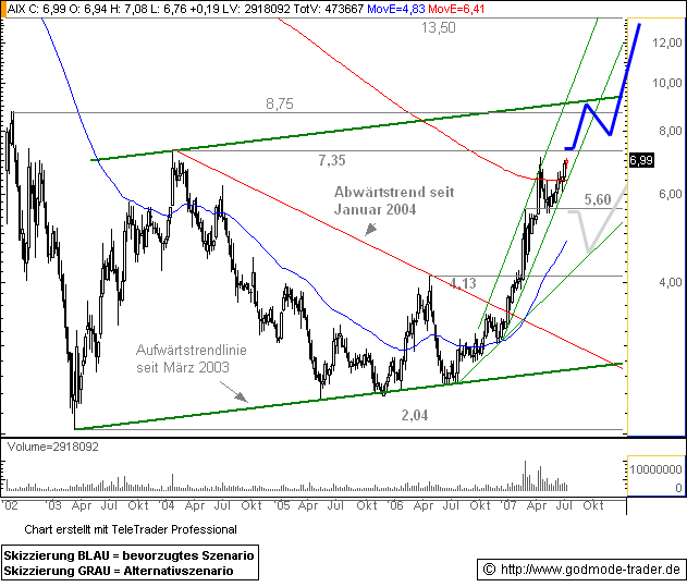 Die Döneraktie Aixtron klopft seit langer Zeit mal wieder an den Widerstand bei 7 € an und wenn diese Hürde fällt, steht die Aktie ganz schnell bei den vorhin erwähnten 17 €, mehr will ich vorerst nicht sagen, denn danach steht die 30 € an, aber davon erst demnächst in diesem Theater.
