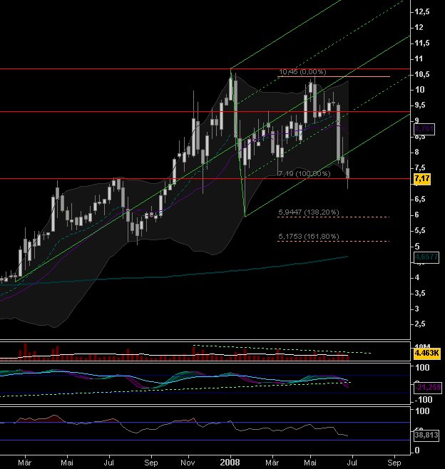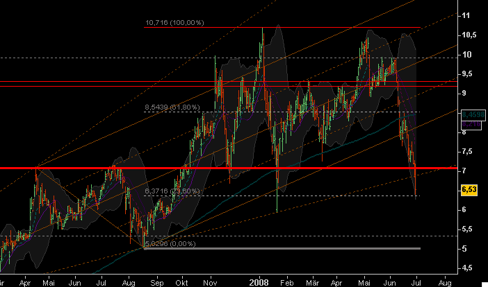 Die Unterstützung oberhalb der 7'ner Marke scheint geknackt. Auch das Januar- Tief (intraday) wurde eingestellt. Allerdings bei noch nicht wirklich eindeutigem Volumen.