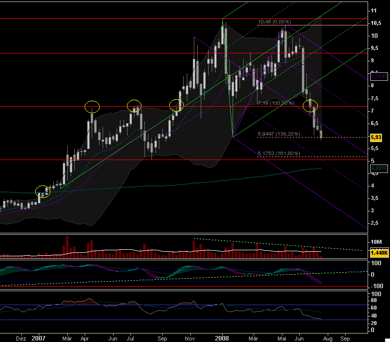 Wubert: Danke für Deinen schönen Chart. Ich denke, bei > 5.0 ist Aix günstig auch ohne Anführungszeichen. Ich selbst werde bislang nicht unter technischen Gesichtspunkten zukaufen. Sondern dann, wenn im Rahmen von Buy And Hold das Chance Risiko hinreichend attraktiv wird. Also dann, wenn es nur noch wenig Luft nach unten, aber reichlich nach oben gibt. Aix hatte ich nie über 6.0 gekauft und werde dies auch nicht. Darunter schon - dies um so mehr, je tiefer es noch geht.