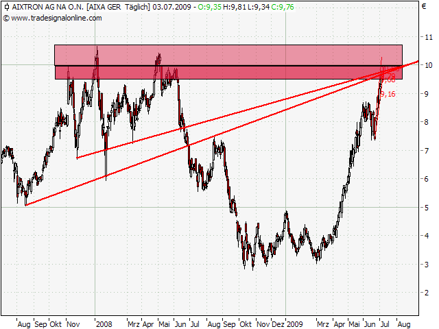 Die Aktie von AIXTRON gewinnt aktuell 1,41 Prozent auf 9,34 Euro. (02.07.2009/ac/n/t)