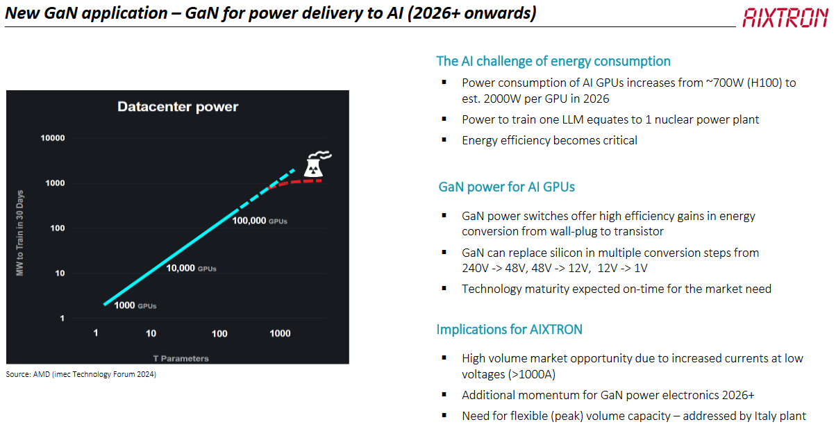 Blättern Sie zu Seite 10. Werfen wir einen Blick auf die GaN-Stromversorgung für KI-Chips. Sie alle wissen, dass eine der größten Herausforderungen für KI der Energieverbrauch ist. Der Stromverbrauch von NVIDIA-KI-Chips steigt von 2020 bis 2025 um den Faktor drei. Eine kürzlich im Handelsblatt veröffentlichte Studie geht davon aus, dass der weltweite Stromverbrauch durch KI von etwa 40 Terawattstunden im Jahr 2023 auf etwa 140 Terawattstunden bis 2028 steigen wird. Dies geschieht in fünf Jahren oder einer CAGR von 30 % pro Jahr. Auf dem IMEC Technology Forum in diesem Jahr zeigte Lisa Su, dass der Stromverbrauch, der zum Trainieren der nächsten LLM-Generation benötigt wird, der Leistungsabgabe eines ganzen Kernkraftwerks entspricht, eine ziemlich große Zahl. Kurz gesagt: Die Branche muss sich mit dem Stromverbrauch von KI-Chips befassen, um die weitere Weiterentwicklung dieser Technologie zu ermöglichen. Wir können und werden mit GaN zur Stromversorgung dazu beitragen, diese Herausforderung zu meistern. In der nächsten Generation von KI-GPUs werden GaN-Schalter nach und nach in der Umwandlungskette vom Wandstecker mit 240 Volt bis zur einzelnen CPU und zum Transistor mit 1 Volt eingesetzt. Die Umwandlung und Verteilung über den Chip erfolgt in mehreren Schritten, zuerst bis auf 48 Volt, dann auf 12 Volt und schließlich auf 1 Volt, wo der einzelne Transistor sitzt. Bei all diesen Umwandlungen haben Sie heute Silizium-Leistungsbauelemente, und sie werden in Zukunft alle durch Galliumnitrid-Chips ersetzt, um die Umwandlungseffizienz zu erhöhen. Dies ist besonders interessant, da die Farbstoffgröße mit der Stromstärke zunimmt. Vereinfacht ausgedrückt könnte man sagen, dass Sie für ein 1.000-Watt-Netzteil oder eine 1-Ampere-Stromversorgung vier bis fünf Schalter mit 1 Ampere benötigen, um die Last bei 240 Volt zu tragen. Aber in der Nähe der einzelnen CPU und des einzelnen Transistors benötigen Sie möglicherweise tausend Schalter mit 1 Ampere, um dieselbe Last zu tragen, und da bei 1 Volt 1 Volt die Spannung ist, die innerhalb des Chips verwendet wird. Das ist nicht genau die Mathematik, aber es dient zur Veranschaulichung der Idee, dass Sie umso mehr Zuckungen und umso mehr Farbstoffgröße benötigen, je weiter Sie die Spannung senken. Wir erwarten, dass sich diese Wachstumschancen bei Galliumnitrid ab 26 oder 27 ergeben.