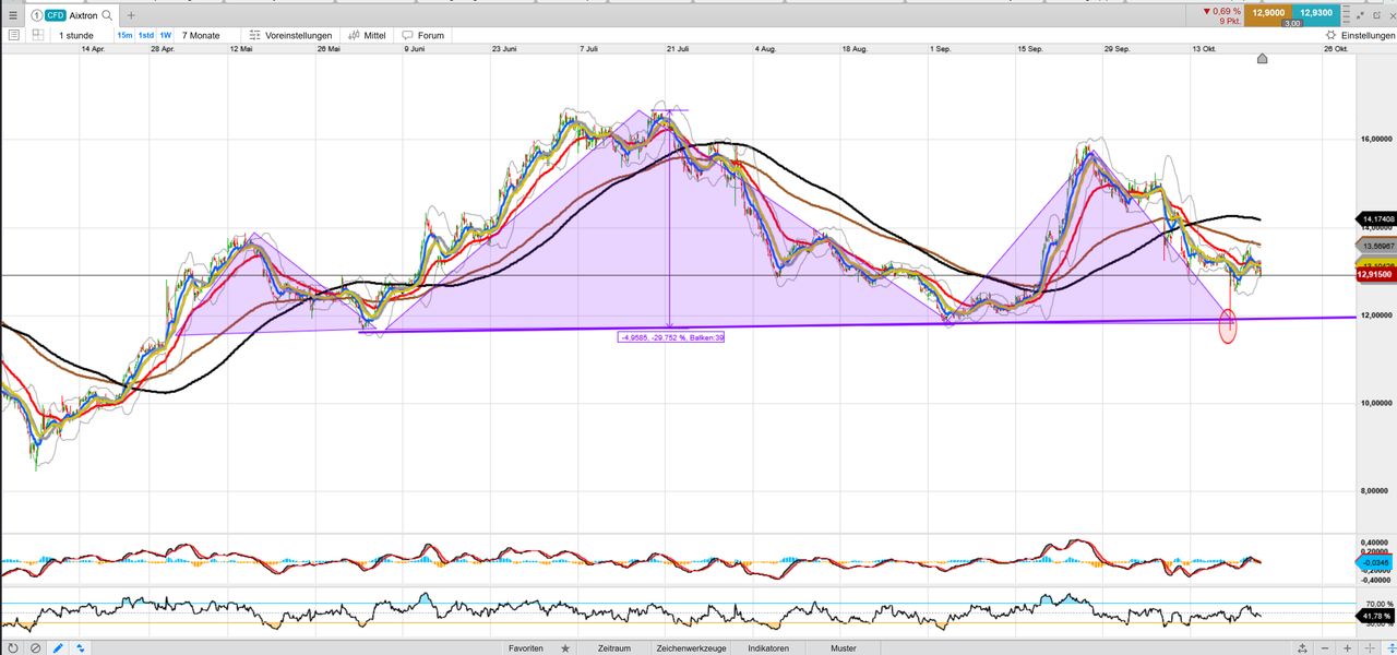 Im übrigen hat Aixtron durch den starken Abverkauf am 17.10 eine SKS aktiviert und wie so häufig sind wir wieder in die Formation zurückgelaufen. Die Nackenlinie verläuft zur Zeit bei ca. 12 EUR. Darunter könnte es eine kräftige Korrektur geben. Da die SKS eine Höhe von fast 5 EUR hat, kann sich jeder die mögl. Ziele selbst ausrechenen.