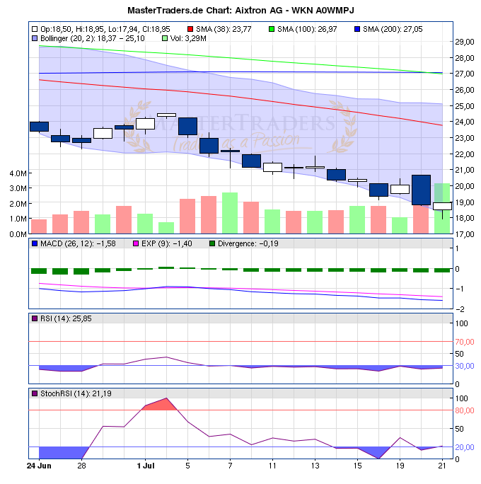 Jetzt ist der Kurs ja erst mal schön an der "magischen" Grenze von ca. 17,90 abgeprallt. Mal sehen, ob es die Tage noch weitere Tests gibt oder ob eine kleine Erholung in den Bereich 20-22 einsetzt. Das wäre ein Bereich, in dem eigentlich auch schon negative Meldungen zum Q2 eingepreist sein müssten. Spannend bleibt es auf jeden Fall.