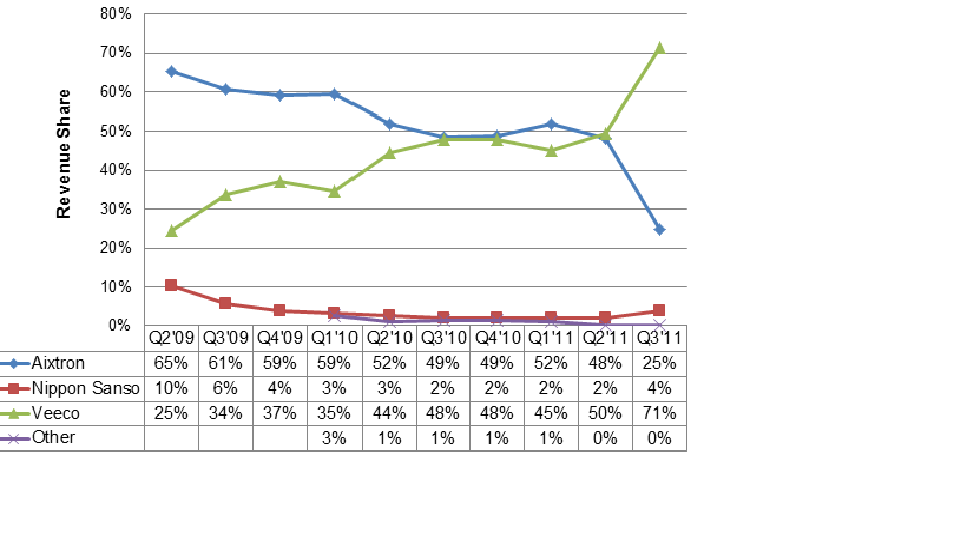 wenn du dir deinen chart mal ansiehst und dann reflektierst, wann die unwissenden chinesen auf den LED-zug aufgesprungen sind, findest du die erklärung für den rückgang des aixtron-marktanteils von 60 auf 50% (Q3 ist durch einen sich nicht wiederholenden sonderfaktor überzeichnet).