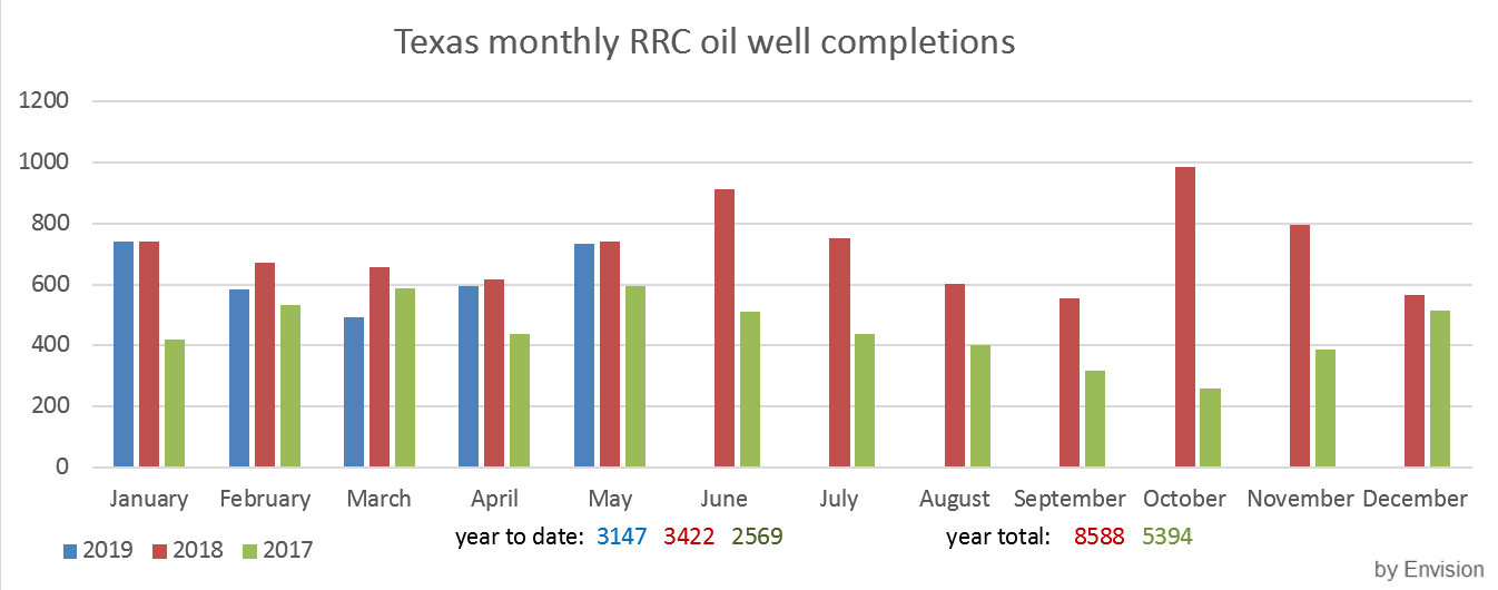 Anbei noch Grafik zu den Texas Oil Completions im Mai, die US Förderer mit verlatener Aktivität, Juni könnte mit dem aktuelle Preisniveau dann eher unterschiessen, aber die Lager laufen ja trotz allen voll, Theorien über zuviel US Produktion von schwer verkaeufliches Leichtöl/Kondensat, zuwenig Nachfrage von Konjunktur und - in USA - wetterbedingt vom Agrarbereich und zu hoch angegeben Exporten durch EIA machen die Runde, vermutlich wirkt alles irgendwie zusammen.