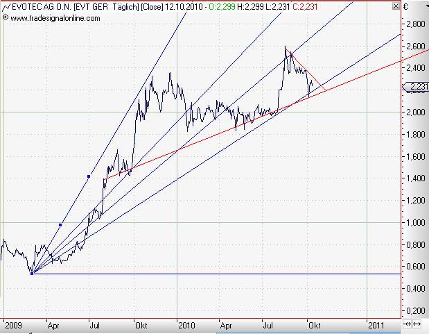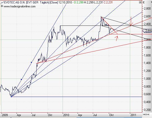 Worauf es ankommt ist, ob wann und wie evotec nachhaltig schwarz schreibt. Wird das ab 2012 bleiben wir auf kurze Sicht bei 2 €, mittelfristig bis unter 3 €, kommt das 2011, geht es flotter an die 3 €. Gibts nix, sind wir schnell wieder unter 2 €.
