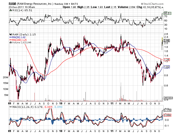 RAM Energy Resources, Inc. (RAM) has skyrocketed the past few days, and the big news here is that Floyd Wilson will become CEO of RAM Energy Resources. Keep in mind that Wilson was chairman and CEO of Petrohawk (HK) before that company was sold to BHP Billiton (BHP). Wilson is also investing big in RAM Energy Resources, and the deal includes $275 million of common stock, $275 million of convertible notes, and $110 million of warrants. Here’s what RAM Energy Resources founder, Larry Lee, has said about the change in direction: