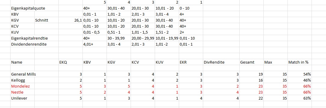 Jetzt habe ich mir ein Punktesystem überlegt. Pro Kennzahl gibt es maximal 5 Punkte. Dann überlege ich mir jeden Monat eine Branche in welcher ich zuschlagen möchte. Ich habe es anhand der Branche Lebensmittel mal gemacht mit den mir bekannten Firmen: Wir ihr seht, würde Mondelez und Nestle, die meisten Punkte erreichen, ich würde dann das Unternehmen wählen mit dem geringeren KUV.