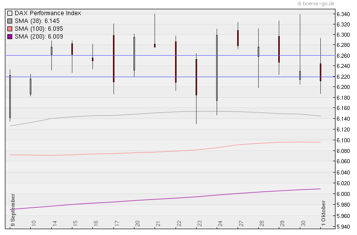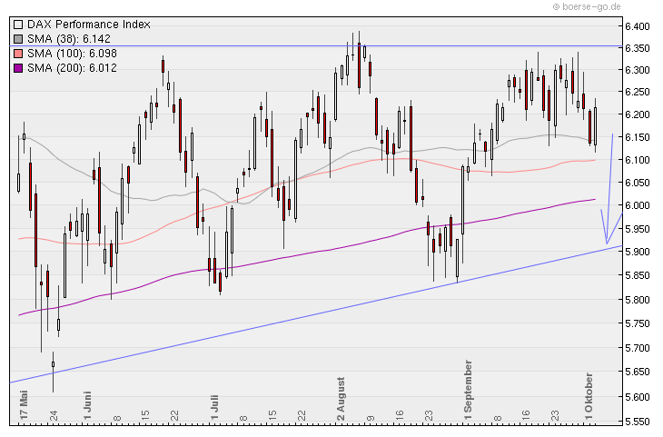 Der DAX ist in dieser 39.Kalenderwoche um -1,38% oder -87 Punkte gefallen und steht jetzt bei 6.211 Punkten ! Entgegen der Erwartung ist der Durchbruch nach oben ausgeblieben und wenn man sich den Chart anschaut könnte dies der Beginn einer neuen Abwärtsbewegung in Richtung der unteren Begrenzung des aufsteigenden Dreiecks bei 5.900 oder zumindest zur 200-Tage-Linie bei 6000 Punkten sein !