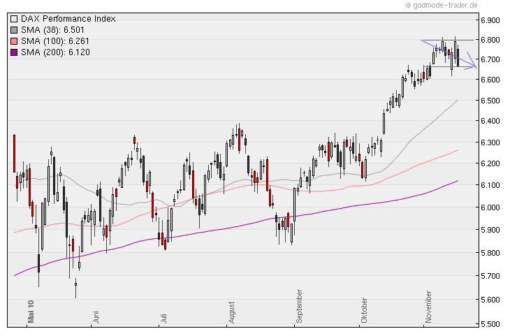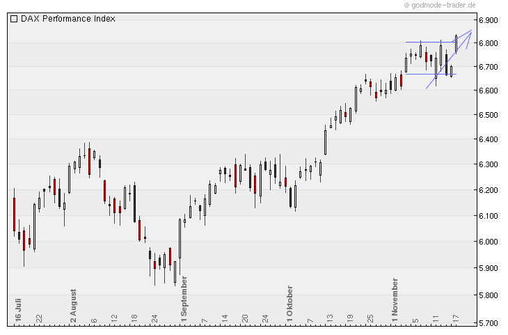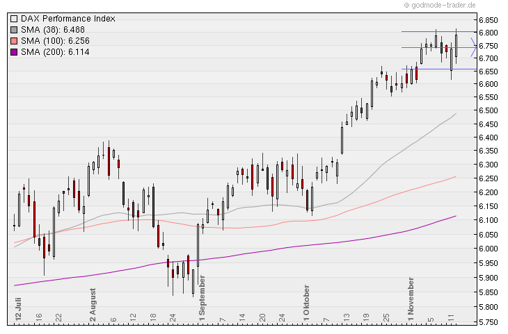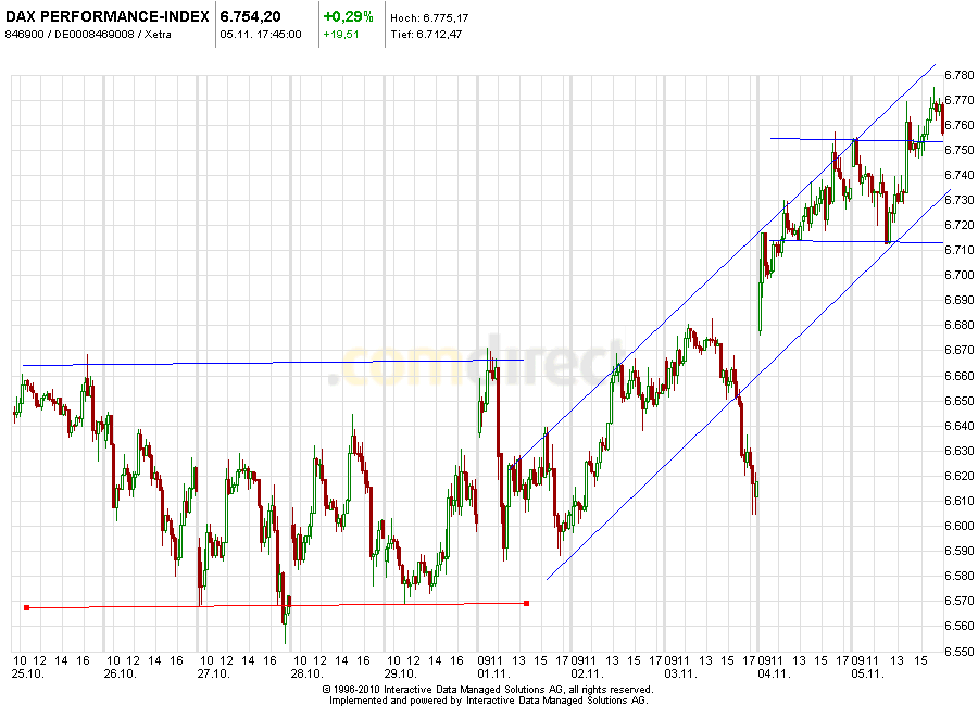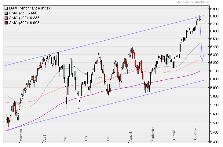 Der DAX ist in dieser 44.Kalenderwoche um gewaltige +2,32% oder +153 Punkte gestiegen und steht jetzt bei 6.754 Punkten !!! Der DAX-Chart lässt erwarten dass der obere Umkehrpunkt spätestens an der langfristigen oberen Begrenzung des Aufwärtstrendkanals bei 6.800 Punkten liegt und dass der DAX dann bis mindestens 6.600 und maximal bis 6.400 zurückfallen wird !