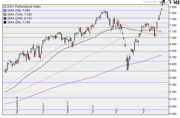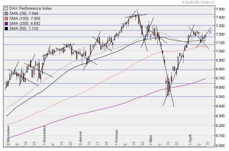 Der DAX ist in dieser 14. Kalenderwoche nur um +0,52% oder 37 Punkte gestiegen und steht jetzt bei 7.217 Punkten ! Aus dem Chart ist klar erkennbar, dass hier eine Topbildung vorliegt und deshalb ist zu erwarten, dass der DAX in der nächsten Woche bis auf die Unterstützung bei 7.000 zurückfallen wird, wo auch die steigende 100-Tage-Linie eine zusätzliche Unterstützung bildet !
