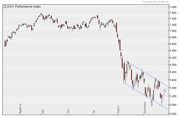 6. Notprozyklik bei extremer Trendstärke: Wenn lupenreine steile und enge übergeordnete Trendkanäle vorliegen in denen keine inneren Trendkanäle vorhanden sind dann liegt e x t r e m Trendstärke vor, wie es beim DAX-Crash der Fall war, und dann gilt der Grundsatz der N o t p r o z y k l i k bei der zu 100% nur noch prozyklisch gestaffelt dem Trend gefolgt werden darf und Antizyklik vollständig v e r b o t e n ist !!!
