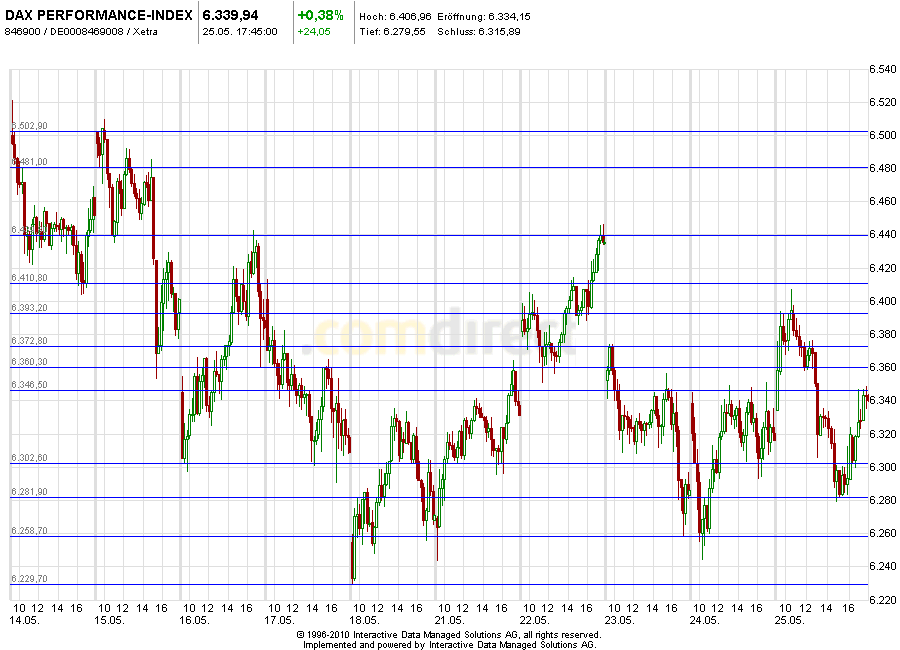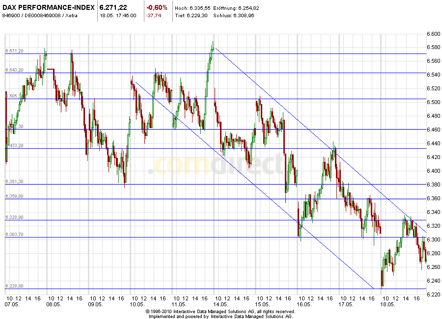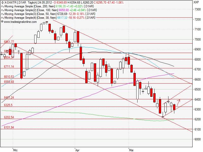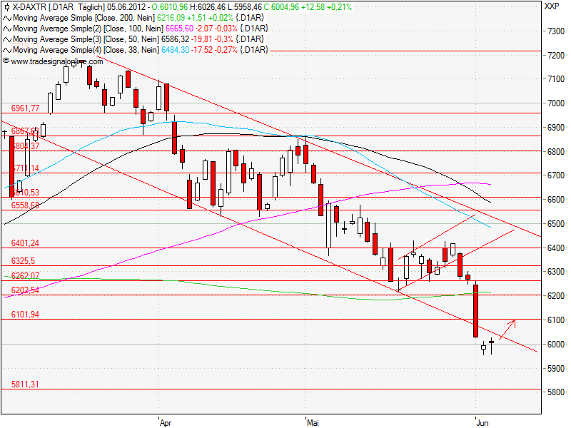 Wie erwartet ist der DAX am Freitag weiter in Richtung der 200-Tage-Linie bei 6.200 Punkten gefallen, aber die letzte weiße Tageskerze zeigt, dass diese Unterstützung mehr Macht hat als die horizontalen Linien und deshalb ist morgen mit einem Abprall nach oben in Richtung des neuen Kursziels bei 6.350 Punkten zu rechnen !!!