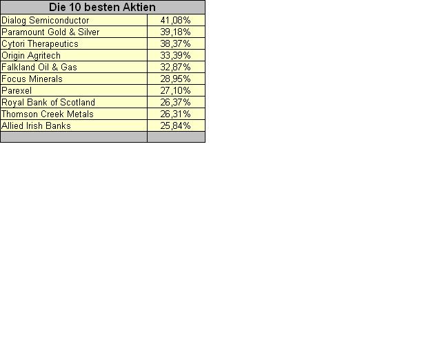 Die beiden Aktie mit dem besten Start, Dialog Semiconductor und Paramount Gold & Silver, sind in deutschen Indizes gelistete ausländische Unternehmen. Zufall? - wahrscheinlich. Allerdings ist Asian Bamboo auch nicht schlecht gestartet. - Sogar zwei verprügelte Banken, die RBS und die Allied Irish Bank, sind unter den Top 10. Washington Mutual als Looser-Sparkasse folgt dann sogar noch auf Platz 11. - Werden die Aktien von Banken und Sparkassen, die die Finanzkrise mitverursacht haben, etwa die Gewinneraktien 2010 sein? - Warten wir's ab.