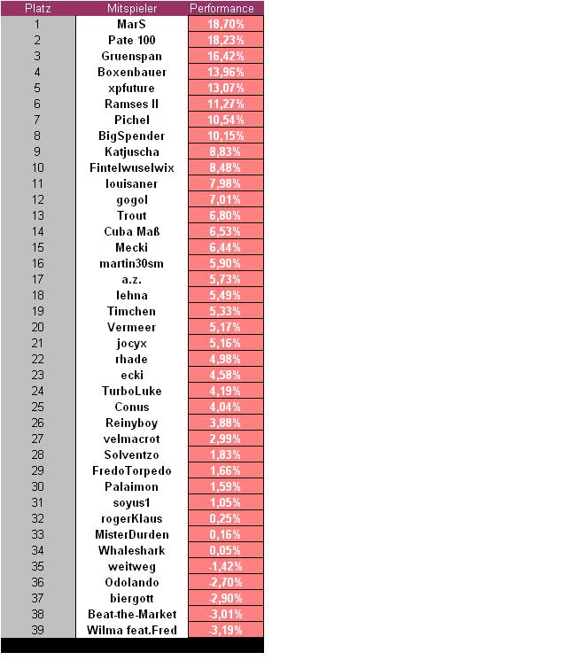 Den besten Start erwischten in diesem Jahr MarS und Pate 100, gefolgt von Gruenspan, Boxenbauer und xpfuture. Unser Vorjahressieger Ramses II kann sich immerhin auf Platz 6 wiederfinden. Auch der Dritte des letzten Jahres, Trout, befindet sich noch im oberen Tabellendrittel.