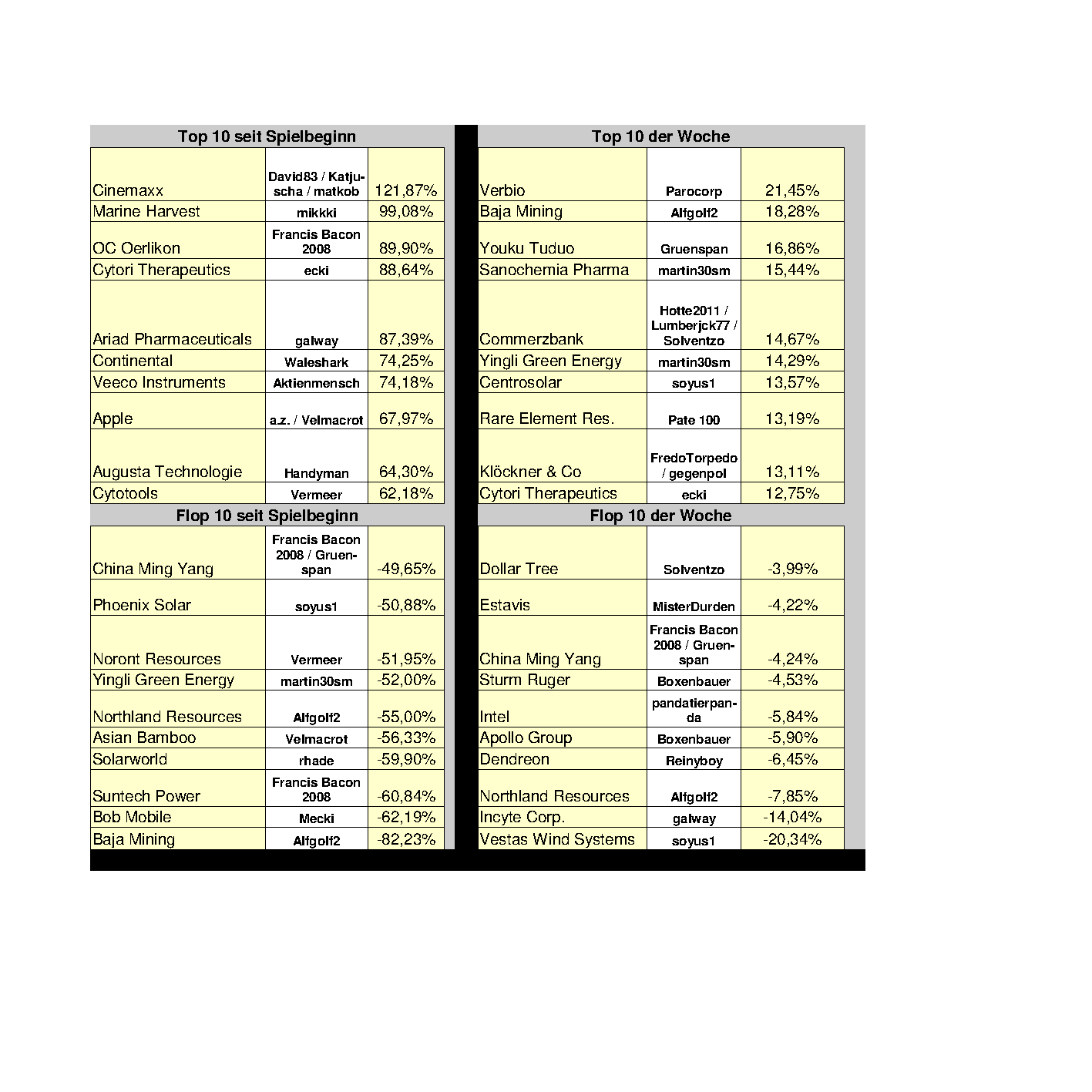 David83 und Katjuscha bilden weiterhin das Spitzenduo. Cinemaxx, Softing und Drillisch konnten weiter steigen. Durch den Kursanstieg bei Morphosys konnte Katjuscha den Rückstand zu David83 nicht höher werden lassen, der die 3 Aktien höher gewichtet hat.