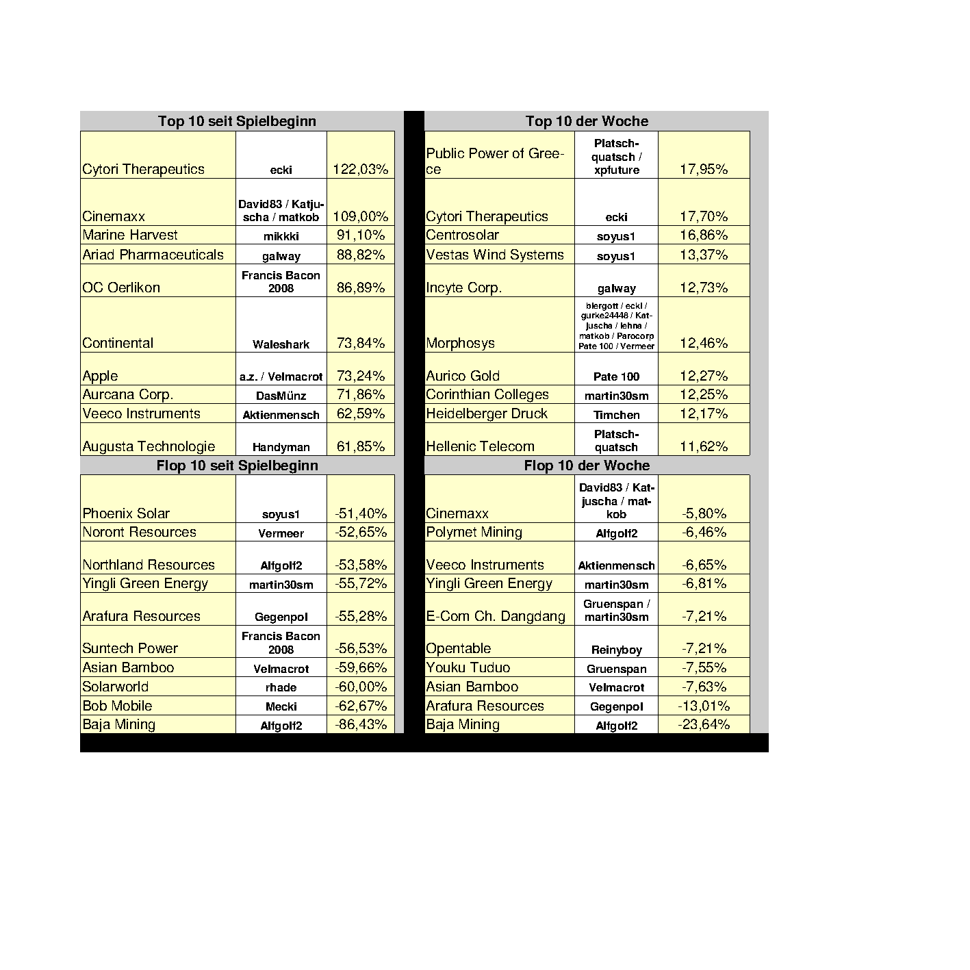 Cytori Therapeutics zieht an Cinemaxx vorbei, ist nun beste Aktie im Spiel. Glückwunsch an ecki. Auch wegen Morphosys. Das war ein guter Freitag für alle, die Morphosys im Depot haben. +15% am Hexensabbat. Katjuscha rückt in der Gesamtwertung nun näher an David83 heran, hat ihn vielleicht auch schon überholt. Es bleibt also spannend da oben.