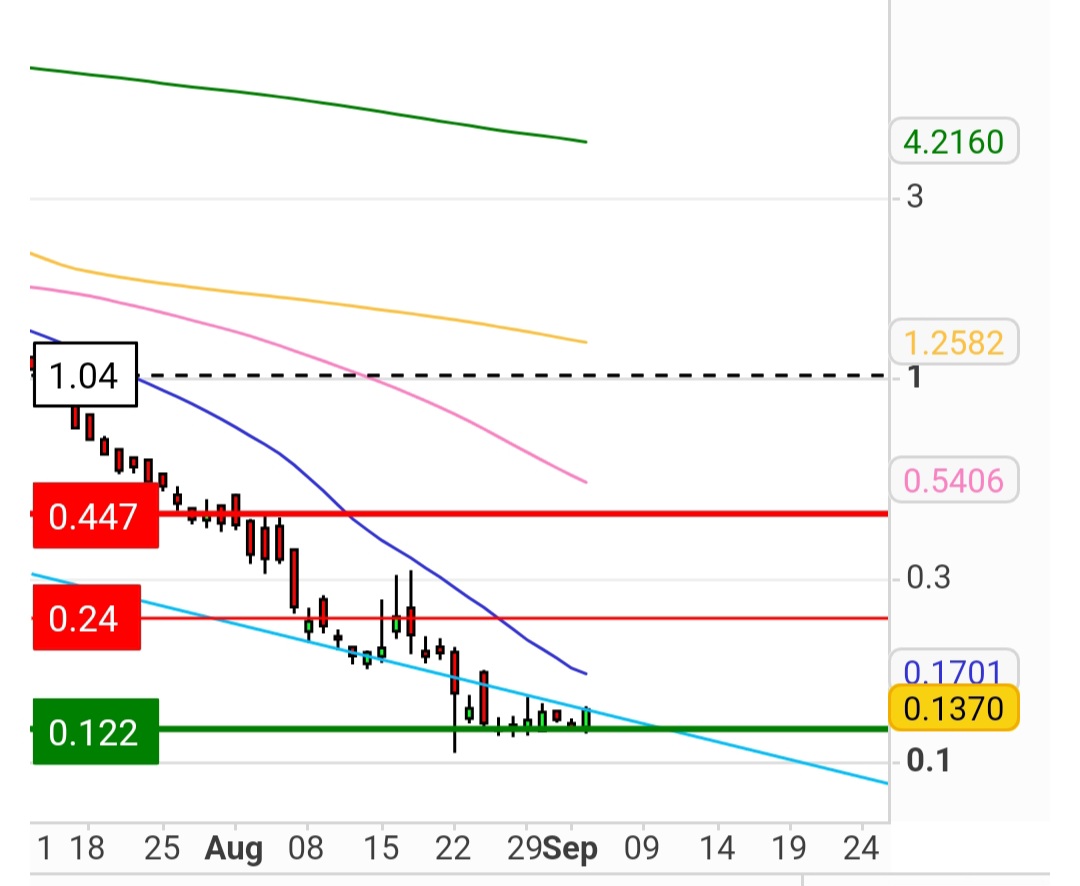 Mein Zielbereich liegt bei 0.20-0.24 USD. Darüber wären auch 0.40 USD möglich. Der Kurs ist verdächtig eingekeilt über der unteren  mittleren Abwärtstrendlinie. Wie immer keine Anlageempfehlung . Good luck ;-)