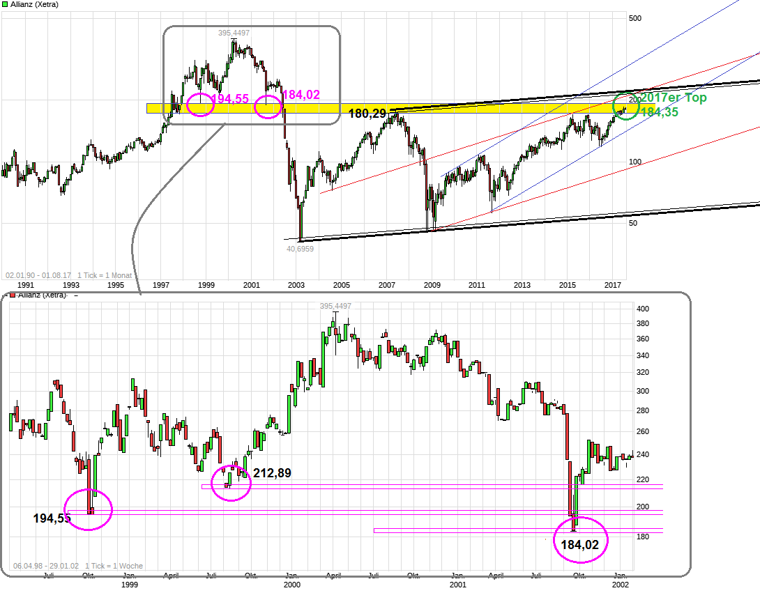 Von daher sicher ein Themenbereich der den Allianzkurs weiter trägt ( wenn kein Schadensgroßereignis noch hinzukommt). Auf der anderen Seite muß man natürlich auch mal abwarten wie lange/tief sich die laufende Konsolidierung des Gesamtmarkts noch hinziehen wird. Sollte der DAX noch Richtung 12090 (Gap Close) gehen oder sogar nochmal unter 12000 schauen, dann dürfte es nicht leicht sein für den Allianzkurs sich weiter über diesem frischen 15 Jahreshoch zu etablieren und man könnte dann eher weiter in dieser Range von grob 170/80 hängenbleiben. Schauen wir mal wo der SK heute sein wird. Wäre schonmal gut, wenn der über dem Top von damals (180,29) liegen würde und er die kommenden Tage ebenfalls schafft. Momentan ist man wieder unter 180 zurückgefallen. Es gibt ja heute ein Eröffnungsgap gegenüber dem Tageshoch vom Freitag. Könnte sein man schließt dieses Gap nun erstmal und versucht dann nochmal sich über 180 zu etablieren. Noch ist es jedenfalls zu früh schon von einem klaren nachhaltigen Ausbruch über den alten Widerstand von 180,29 zu sprechen. Daher nicht zu sorglos kaufen und meinen das Ding wäre schon final geknackt. Das muß sich erst noch beweisen.