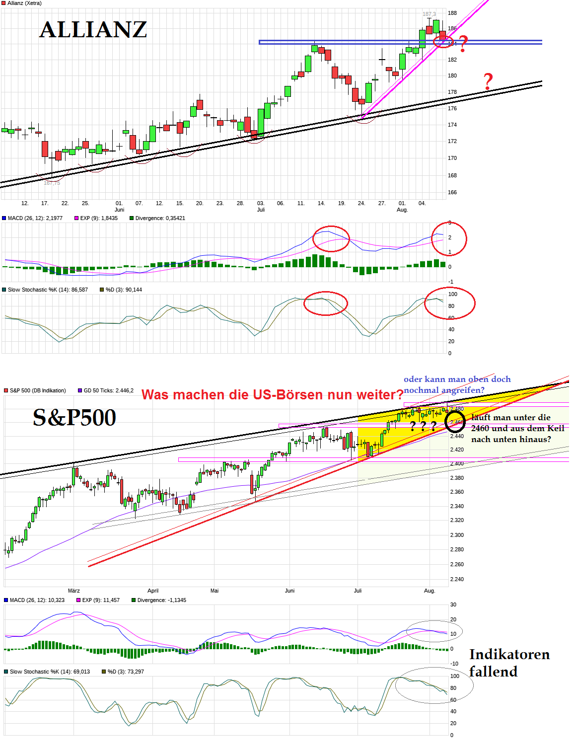 Wird jetzt spannend, ob man weiter die horizontale Unterstützung um die 178 € verteidigen kann. DAX zeigt - anders als die US Börse - aktuell eine allgemeine Schwäche durch den immer schwächer werdenden US-Dollar, der für viele Exportwerte aus Deutschland gewinnmindernd sein dürfte. Das freut natürlich auf der anderen Seite des Atlantiks die US-Werte die Exporte haben. Zudem hat heute Draghi die Entscheidung nach hinten rausgeschoben, wie man man weiter mit einem möglichen Tapering umgehen wird. ( => 20. Juli 2017 - Europäische Zentralbank: Warum wir noch lange auf Zinsen warten müssen - www.spiegel.de/wirtschaft/service/...en-muessen-a-1158929.html ). Entsprechend gibt es jetzt wohl eine weitere monatelange Hängepartie bei der EZB. Die Allianz und andere Werte aus dem Finanzbereich sind ja die letzten Monate vorauseilend schon stark angestiegen, weil man eben schon hoffnungsvoll auf die Zinswende in der Euro-Zone setzt. Mit den Aussagen von Draghi heute, ist natürlich das Thema jetzt weiter nach hinten rausgeschoben worden. Entsprechend fehlt der Allianz ein eigenes Thema was sie positiv vom Gesamtmarkt abkoppeln könnte. Bleibt eben zu hoffen, daß nach dem kleinen Verfallstag morgen, dann DAX &Co. sich wieder fangen. Sollte der DAX z.B. noch bis zu seinem alten Gap im Bereich 12090 laufen, dann dürfte die Allianz kaum an der 178 in Ruhe dabei verweilen.