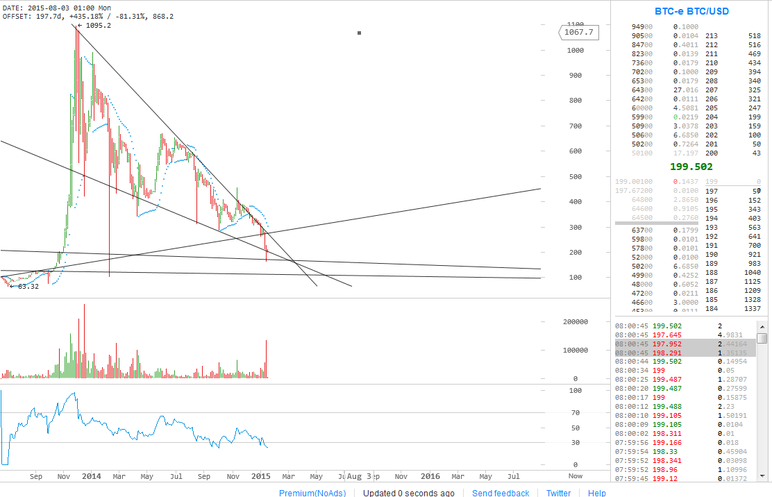 die Linie ganz unten, zeigt warum der BTC hier steht, das ist der verlängerte letzte Ausbruchpunkt, ab ~189,00 US Dollar (die 3 Candlesticks links) sprang der BTC auf 1200 Dollar.
