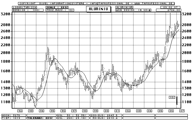 Von echten Versorgungsengpässen kann bei Aluminium nämlich keine Rede sein. Die Lagerbestände an der LME steigen die Lagerbestände seit Dezember 2006 kontinuierlich an. In der vergangenen Woche erhöhten sich die Vorräte um weitere 1.550 Tonnen und liegen aktuell bei gut 750.000 Tonnen. Gegenüber den Tiefständen des letzten Jahres von etwa 660.000 Tonnen bedeutet das einen Zuwachs von fast 14 Prozent. Der Trend zu tendenziell weiter zunehmenden Lagerbeständen dürfte sich bis auf weiteres fortsetzen. In den USA, Europa und Japan sinkt die Nachfrage und in China droht 2007 ein Produktionsüberhang von einer Million Tonnen. Offensichtlich waren die Maßnahmen der Regierung in Peking, den Aluminium-Output signifikant zu senken, um das ausufernde Energiedefizit in den Griff zu bekommen, nicht wirklich erfolgreich.