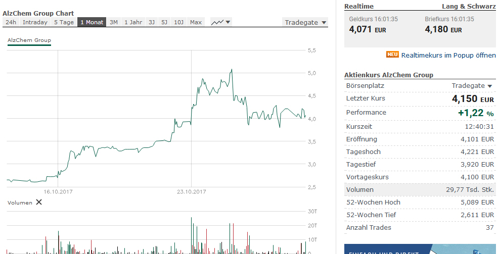 OK, danke für den Hinweis jetzt verstehe ich auch warum bei finanzen.net die Kurve vor Oktober seit gestern abgeschnitten ist und jetzt bei 2.30 EUR startet. Die Nachfrage bleibt hoch sonst wären nicht die größten Volumen an Kauforders von 17.000 Stück am Montag bei 5 EUR gewesen. Der Markt entwickelt sich positiver als bisher angenommen und es gibt fast nur noch grüne Vorzeichen seit dem gestrigen EZB Zinsentscheid. Selbst ein KGV von 20 ist noch nicht übertrieben siehe Evotec die kaufen heute schon wieder trotz KGV von 50. Die Chemieaktien führen heute erneut alle DAX Listen mit den besten 10 Werten an und Alzchem soll den Gewinn bis 2018 verdreifachen daher waren 5 EUR gerechtfertigt und der Höchstkurs lässt sich sicherlich schwer vorhersagen vor den Quartalszahlen im November? Anbei noch ein weiterer Bericht zum damaligen geplanten Börsengang im Februar schauen wir daher mal wie sich der Kurs weiter entwickeln wird: www.goingpublic.de/ipo-im-fokus-alzchem